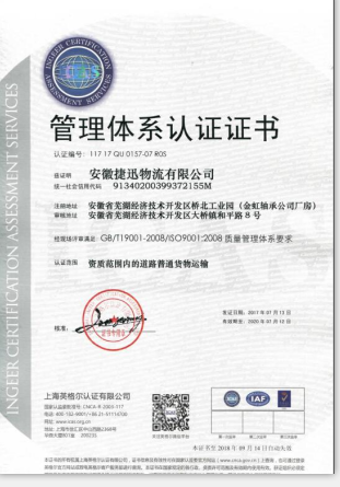 恭喜安徽捷迅物流有限公司荣获ISO9001质量管理体系认证证书!
